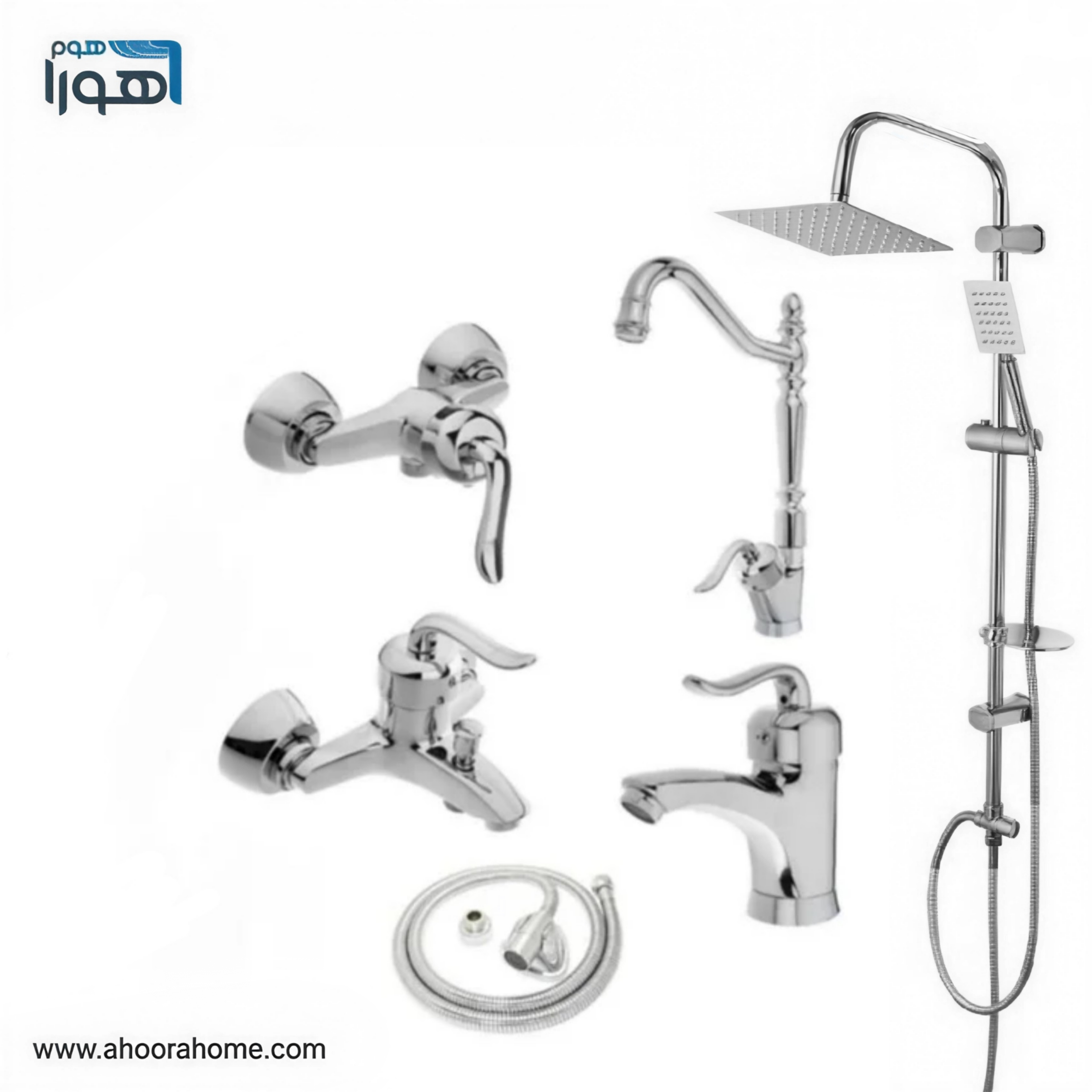 ست6تکه شیرآلات آلنر مدل قاجاری همراه با علمدوش استیل و شلنگ توالت AHOORAHOME